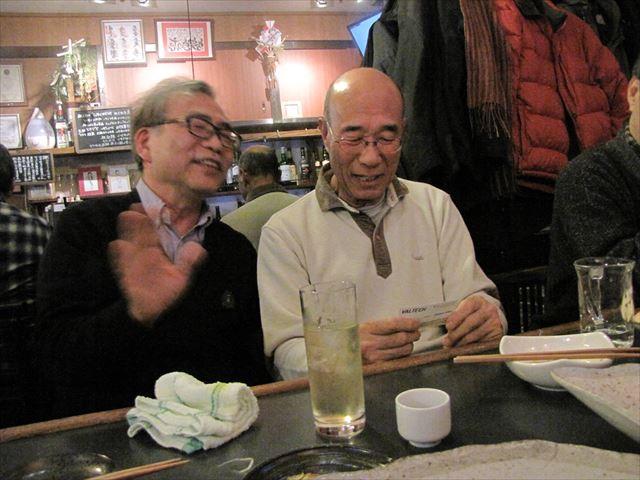 昨夕、表記同窓会新年会を挙行しました。 前日に須原さんから参加申し込みがあって8名の会になりました。 浜田・男沢・須原・明円・相場・新田・牧・高梨です。 8席のカウンターだけのお店なので、過不足なく席が埋まりました。 私としてはもう一人多くて、誰かが吊手(ないけど)を持つとか床にじかに座るとかいう 事態を密かに期待していたのですが、残念ながらそうはなりませんでした。 席上、「古希の旅行」の宣伝をしました ・川村さんが並々ならぬ入れ込みようで企画していること ・古希とはいっても数え年の70歳ではなく満70歳の来年にやること ・できれば請川・遠藤未亡人や林孝子さんにも声を掛けたいこと などが主な内容です。川村さんに対するプレッシャーも多少はありますけど また、北海道方言の話になったとき、つぎの話をしたNHKアナウンサーの名前が出て こなかったんだけど、さきほど思い出しました。「国井雅比古」でした。 その話というのは、NHKの番組で方言が取り上げられたことがありました。 日本各地を転勤するNHKアナウンサーの国井さんは旭川放送局に在籍したことがあり、 そこで聞いた「ナーンもさ、ナンモ、ナンモ」という言葉が胸に沁みたそうです。 感謝の言葉に対して「気にしないでください」という返答を素朴に優しく返されて、 それが強く心に残っているというものでした。 新田さんが撮ってくれた写真は全部で18枚あります。 飛んでいる番号の6枚の写真は見られては具合の悪いものです。そんなことナイか! 4時開始はそれなりに評価されましたが、「もっと早く」とか、「週末ではなくウィー クデーに」という意見もいただきました。 私としては「帰りの電車の混み様」を配慮して週末に設定したのですが、ウィークデー でも超早い時間にして退勤時間前に終わらせれば退勤時間は回避できます。 次回の開催にたいしてご希望があればお知らせください。曜日・時間などできれば年に 数回以上の定例の会にしたいと思っています 高梨 ![]() ![]() ![]() ![]() ![]() ![]() ![]() ![]() ![]() ![]() ![]() ![]() ![]() ![]() ![]() ![]() ![]() ![]() |