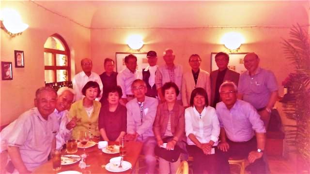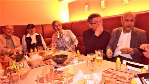 喜多さんの写真に便乗して報告致します。(敬称略) 当日の参加メンバーは、高梨本人から出席を督促?された神野さん(当時事務職員で寮務担当)と 遠藤夫人、喜多さんから笠井夫人へ連絡、廣岡より請川夫人に連絡を依頼し、日頃爺さん達ばか りの集いに彩りを添えて頂きました。(電気)内山、(機械)安孫子、川村、木津、木村時、永原、 林、廣岡、山本、小坂で出席者は 女性4名+男性12名の計16名でした。 17:30からの1次会、林より初年度の明誠寮の名簿の配布もあり、一気に10代に戻ってしまった。 又、2次会は近くのカラオケボックスで行い、22:00前に再会を約束して散会しました。 中尾が来札時の懐かしい写真が1枚ありますね!小坂(まだ存命?)、中尾、請川、笠井、伊藤の 元気な頃 札幌の小坂 |