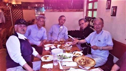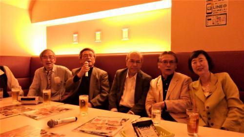 喜多さんの写真に便乗して報告致します。(敬称略) 当日の参加メンバーは、高梨本人から出席を督促?された神野さん(当時事務職員で寮務担当)と 遠藤夫人、喜多さんから笠井夫人へ連絡、廣岡より請川夫人に連絡を依頼し、日頃爺さん達ばか りの集いに彩りを添えて頂きました。(電気)内山、(機械)安孫子、川村、木津、木村時、永原、 林、廣岡、山本、小坂で出席者は 女性4名+男性12名の計16名でした。 17:30からの1次会、林より初年度の明誠寮の名簿の配布もあり、一気に10代に戻ってしまった。 又、2次会は近くのカラオケボックスで行い、22:00前に再会を約束して散会しました。 中尾が来札時の懐かしい写真が1枚ありますね!小坂(まだ存命?)、中尾、請川、笠井、伊藤の 元気な頃 札幌の小坂 |