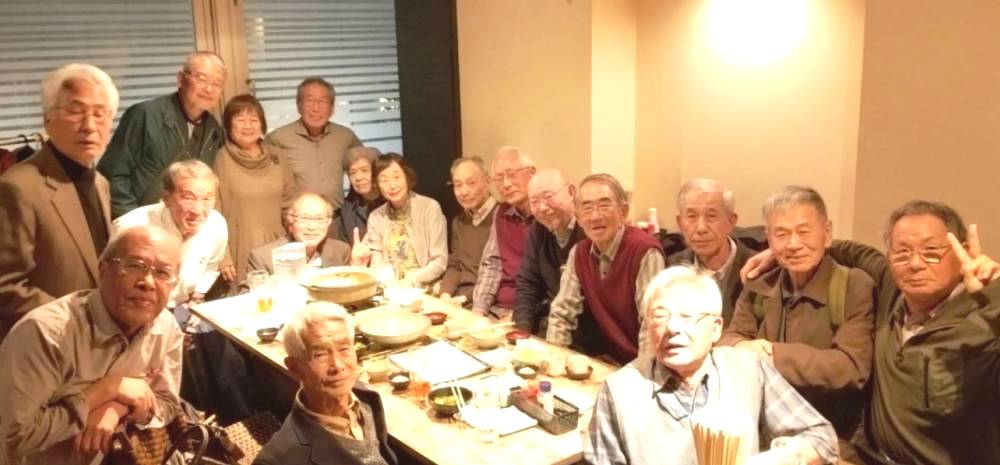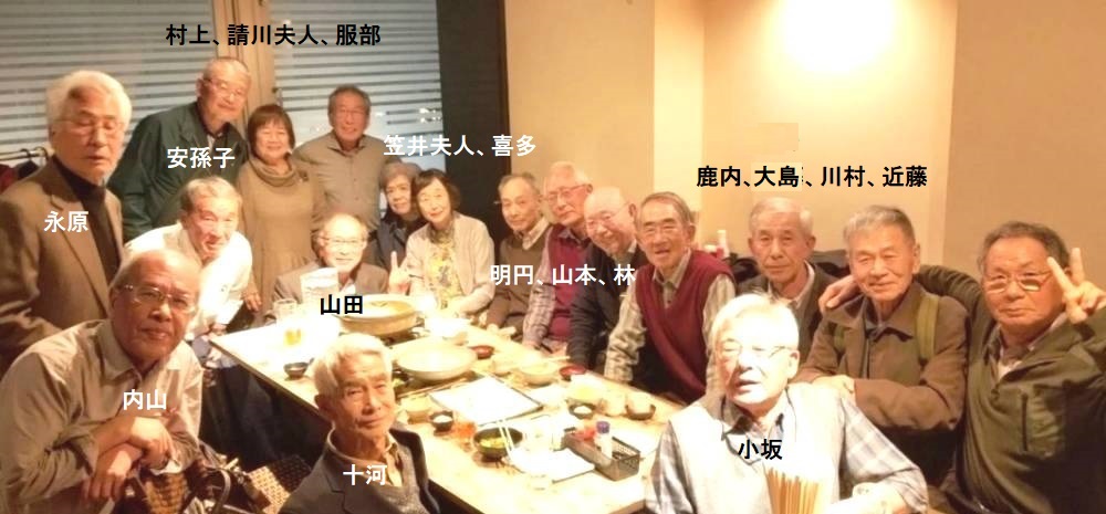 当日、どなたの欠席もなく、先に逝ってしまった同期を偲んで 服部トーチャンの献杯の発声、続いて再会を祝してミョウタンの 乾杯の音頭で前夜祭をスタートしました。 18名の多数ゆえ、男性30秒、女性1分の持ち時間で自己紹介の中 寄る年波からか各自の病歴が多く語られておりました。 卒業以来初めて会うメンバー同士もおりましたが、卒寿を迎えた 現在でも即、昔の感覚に戻れる事は不思議なものです。 2時間語りあった後、最後は大島の再会を期しての乾杯で締めました。 特に請川、笠井両夫人は何かと多忙の中の参加ありがとうございました。 小坂