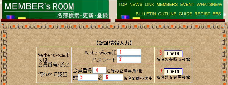方法①:1,2にログインID/パスワードを入力し3をクリック 方法②:4,5,6に会員番号、氏名を入力し7をクリック 会員番号は小文字です。 氏名の漢字が登録漢字と異なるとエラーになります。