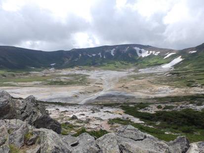 旭岳をふりかえって(間宮岳への尾根より) 間宮岳に向かって お鉢平(間宮岳より)