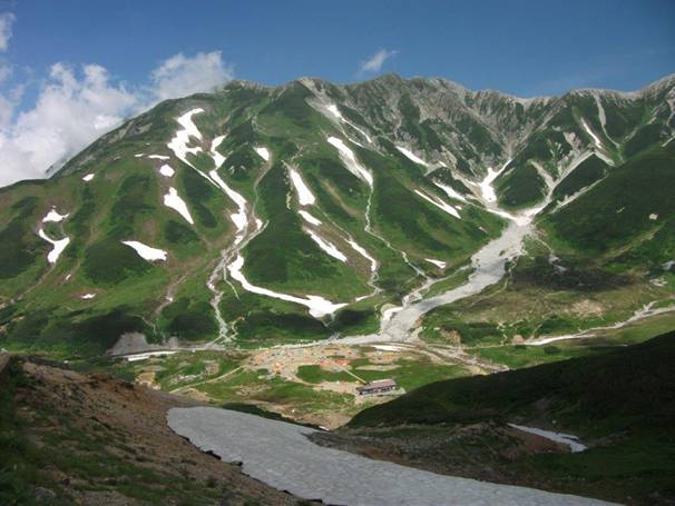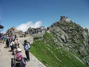 2013年8月9日 立山 2013年 立山登山の報告 ―日光白根山に続いて立山連峰― 2013年8月12日 3E 梅内功 先日の日光白根山に続いて立山を登ってきました。 快晴に恵まれて、南には槍ヶ岳、笠ヶ岳、東には黒部ダム、針ヶ岳、鹿島槍ヶ岳方面、すぐ目の 前には剣岳、大日岳と360度の見晴らしでした。 8月9日(金)富山地鉄ホテルに宿泊。 雄山(3003m)、大汝山(3015m)、富士の折立(2999m)、真砂岳(2861m)の縦走。 6時30分 富山駅前を室堂行きバスで出発。 山を見ると少しガスがかかっているが天候は良く、山頂での快晴を期待して、2時間 半バスに揺られて室堂に到着。 9時05分 室堂を出発。整備された登山道を歩いて、立山室堂山荘を過ぎたころから前後に登 山者の数が増え始める。空は快晴。周りの山並みがきれいに見える。 9時50分 一ノ越山荘着。ここから雄山に向けて登り始める。 上を見ると中学生らしき団体が連なっている。人も詰まってなかなか進まない様子。 わき道を利用しながら、団体を抜いて前へ進む。 10時35分 雄山山頂の休憩所前に到着。山頂の雄山神社へは500円の拝観料が必要。 さらに数メートル登ることになるが、やめた。 槍ヶ岳も見える。黒部ダムを挟んで反対側の山々がきれいに見える。雲があるが ほぼ360度の見晴らし。周囲の風景を撮って次に向かう。 11時00分 大汝山着。立山連山の最高峰。 ここからも槍ヶ岳、笠ヶ岳、黒部ダム、針ヶ岳、鹿島槍ヶ岳方面がきれいに見える。 360度の見晴らしは最高です。 11時20分 富士ノ折立着。真砂岳に向かう。 12時00分 真砂岳出発。 雷鳥沢に向けて下山開始。急坂を下りて、雷鳥沢キャンプ場に到着。たくさんの人が キャンプをしている。みくりが池、みくりが温泉、地獄谷を経由して室堂へ。 13時55分 室堂着。 出発から全工程5時間の登山でした。素晴らしい写真の一部を紹介します。
