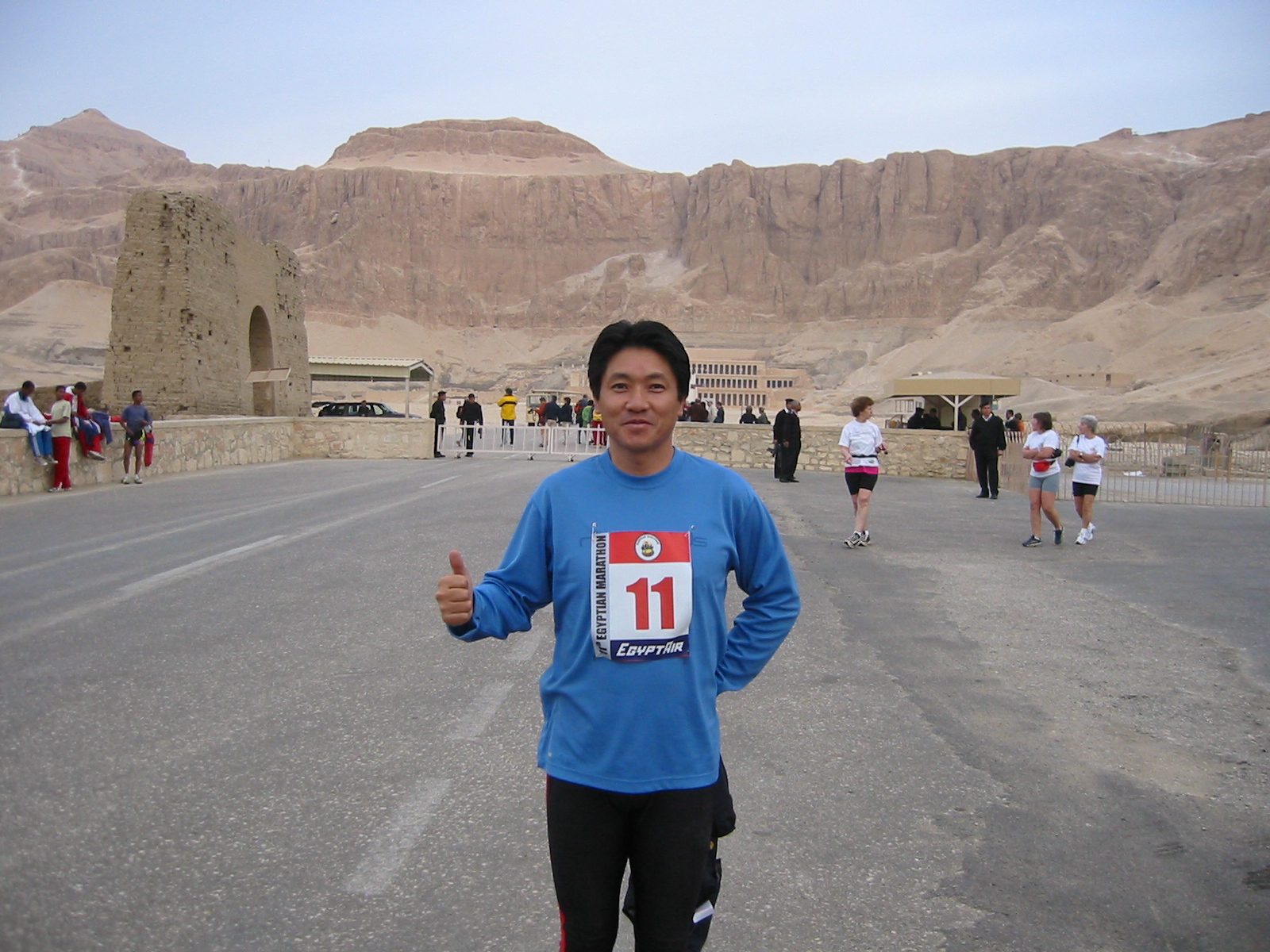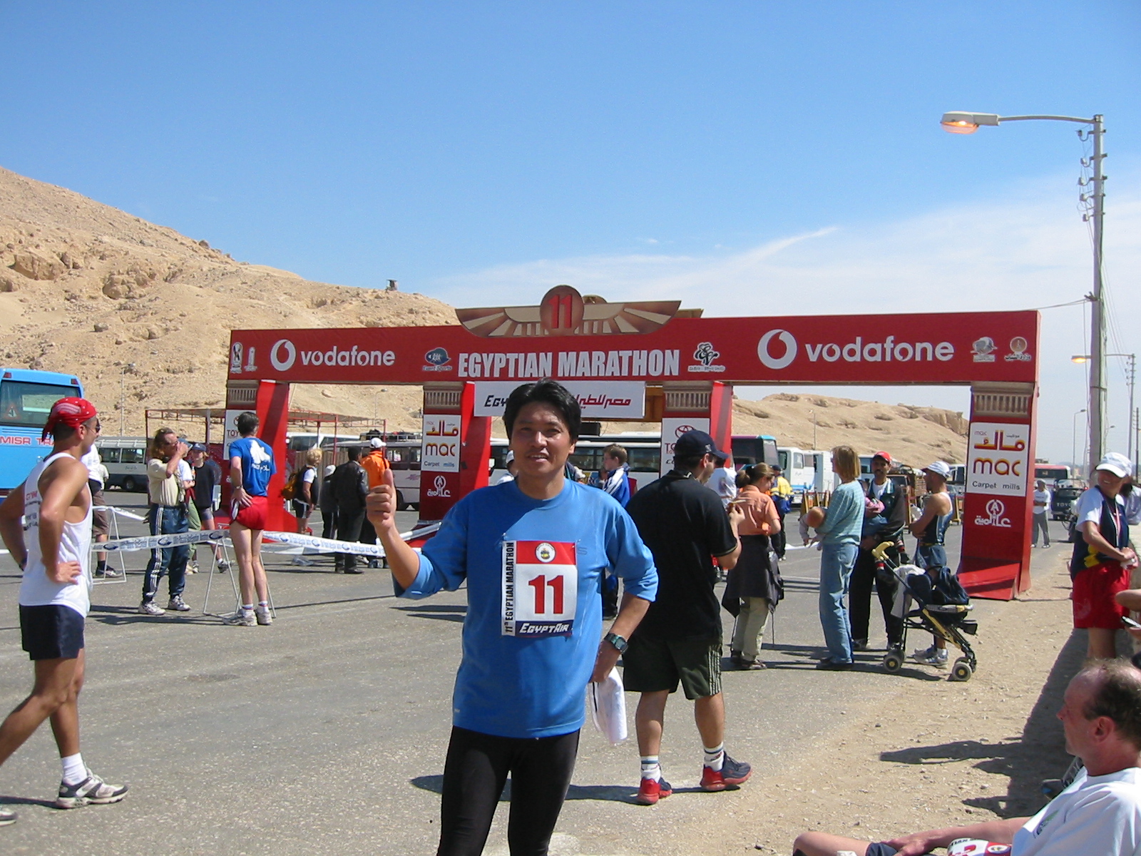 カイロ(エジプト)に赴任中の武田有公さんのルポです 武田、2・20(金)のエジプト ルクソール国際マラソン(42.195KM)無事完走しましたよ。 タイムは、4時間12分で昨年の勝田マラソンより20分も落としました。ほとんどの参加者は、欧米人。フル参加者合計で約100名弱。 日本人フル参加者は、私を含め4名。(日本人では2位でしたが、その昔、中山が出た大会としては納得できるわけありませんよね。) 19日夕方に一人で飛行機でカイロからルクソールへ移動し翌日レース参加後、完走パーテーへ出席後、同日最終便でカイロに戻り昨日21日(土)朝から足パンパンの状態で通常(6:30AM打合せ開始)出勤しました。今日は少し和らいでおります。 こちらの事務所スタッフには予想通り、どうも、変わった日本人に写っているようですね。それでも、今回の参加と完走は、私なりに非常に満足しております。 ルクソールマラソンのスタート・ゴール地点(添付写真のレース前遺跡バックに)は、例の日本人観光客5名が銃乱射事件で射殺された有名な神殿の遺跡です。せっかくのルクソール訪問で遺跡群の中を走るコースでしたが周りの景色はほとんど覚えていません。沿道の応援はほとんどが子供たちで、「マネー、マネー、、」とまとわりついてくるのも、マラソンレース経験で初めての体験でした。 写真添付(2枚:レース前(ハトシェプスト女王葬祭殿をバックに)とレース後) 機会あれば、慰労会でも御願いしますよ。 以上 ありとも より