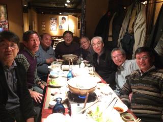 五期ぶ り会の報告です。 3月12日に、旭川と札幌のメンバーが15人、と小林先生も参加していただき大 盛会でした。 学生時代の事はもとより、今の生活(リタイヤの話やら、前期高齢者夫婦や家 族の話)持病と投薬の事など 話は尽きません。 写真を添付します。写真の人物がだれかわからない人は、悩まずおきらめてく ださい。これが礼儀です。 -- 五期振り会旭川の永久幹事 鏡 和充 ![]() 2016年2月26日 会場:じょう(恵比寿) 昨日、恵比寿で新年会をやったので報告します。 出席者はご覧のように8人です。左から、江渕、木村、飛野、渡部、板垣、佐々木、北野、定塚です。 ![]() 今年の7月に赤平の私のログハウスに5期関係の下記8人が集まりました。